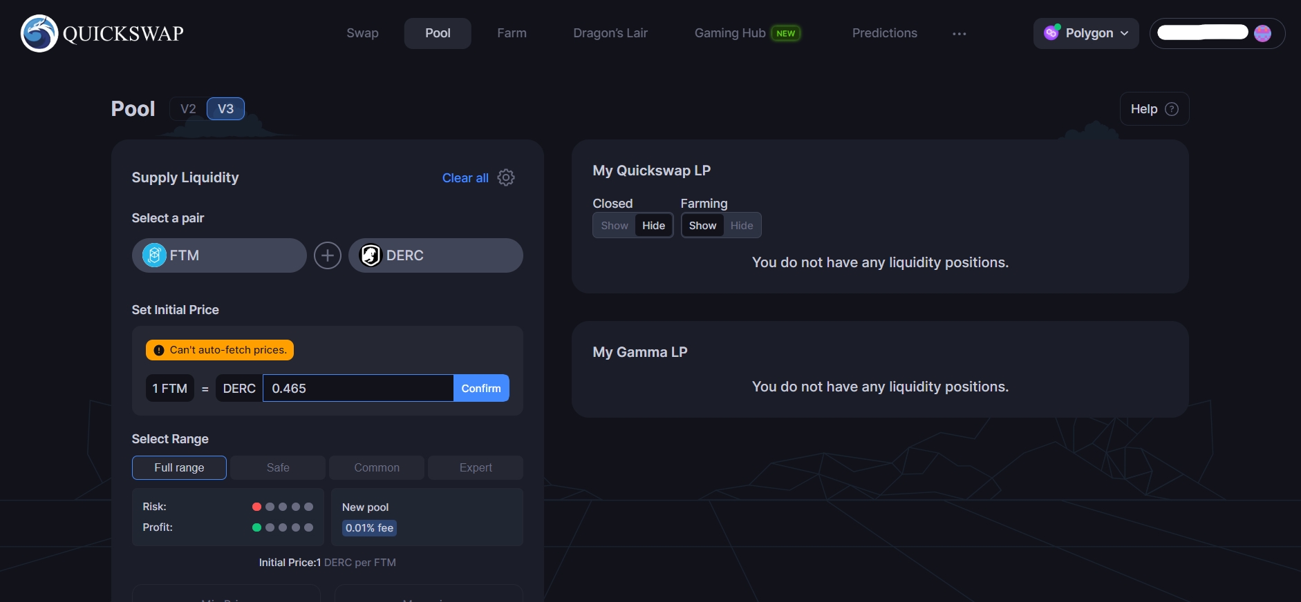 2. Select the token pair you want to provide liquidity to. For this example, we will use FTM/DERC. In some cases, you will need to set the initial price by manually calculating one token’s value relative to the other if the system can’t auto-fetch.