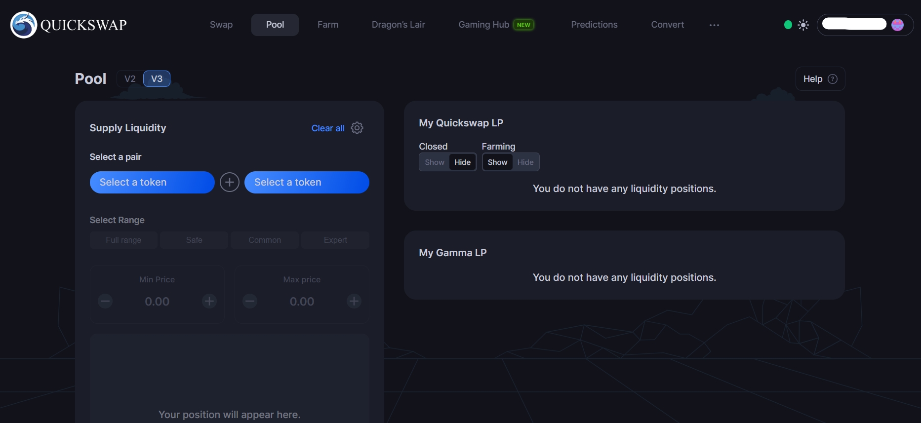 1. Visit https://quickswap.exchange/#/pools and connect your Web3 wallet. You'll be automatically connected to QuickSwap's V3, where you can switch to the Polygon PoS or zkEVM networks in order to use Gamma.