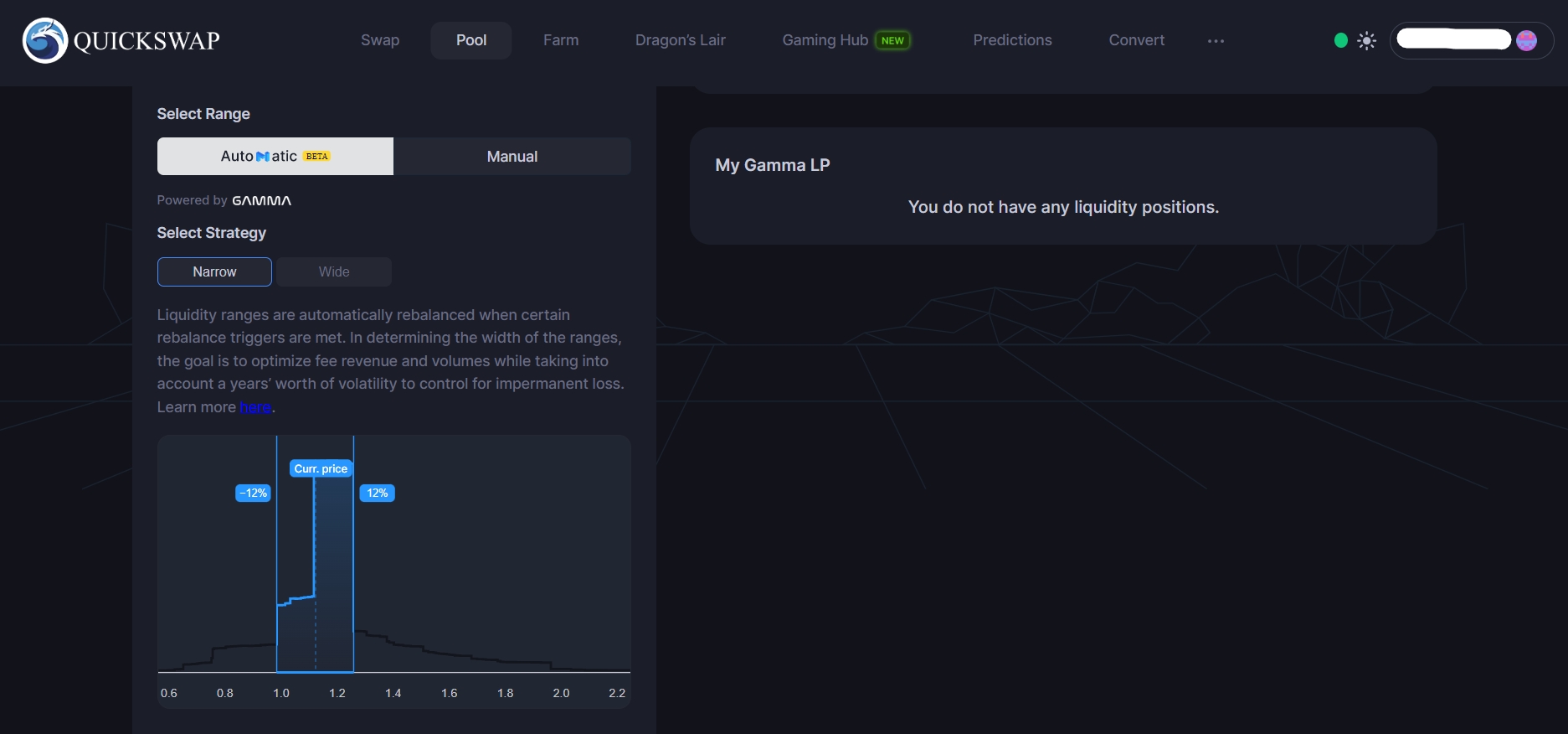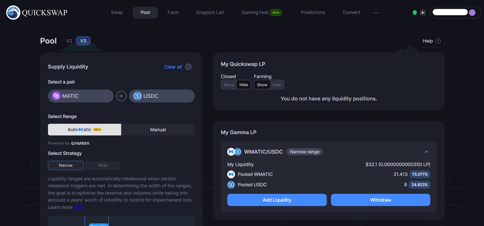 3. Now it's time to select a strategy using the “autoMatic” feature (narrow or wide through QuickSwap's Gamma V3 active liquidity management solution) - you can also manually input your designated price ranges.