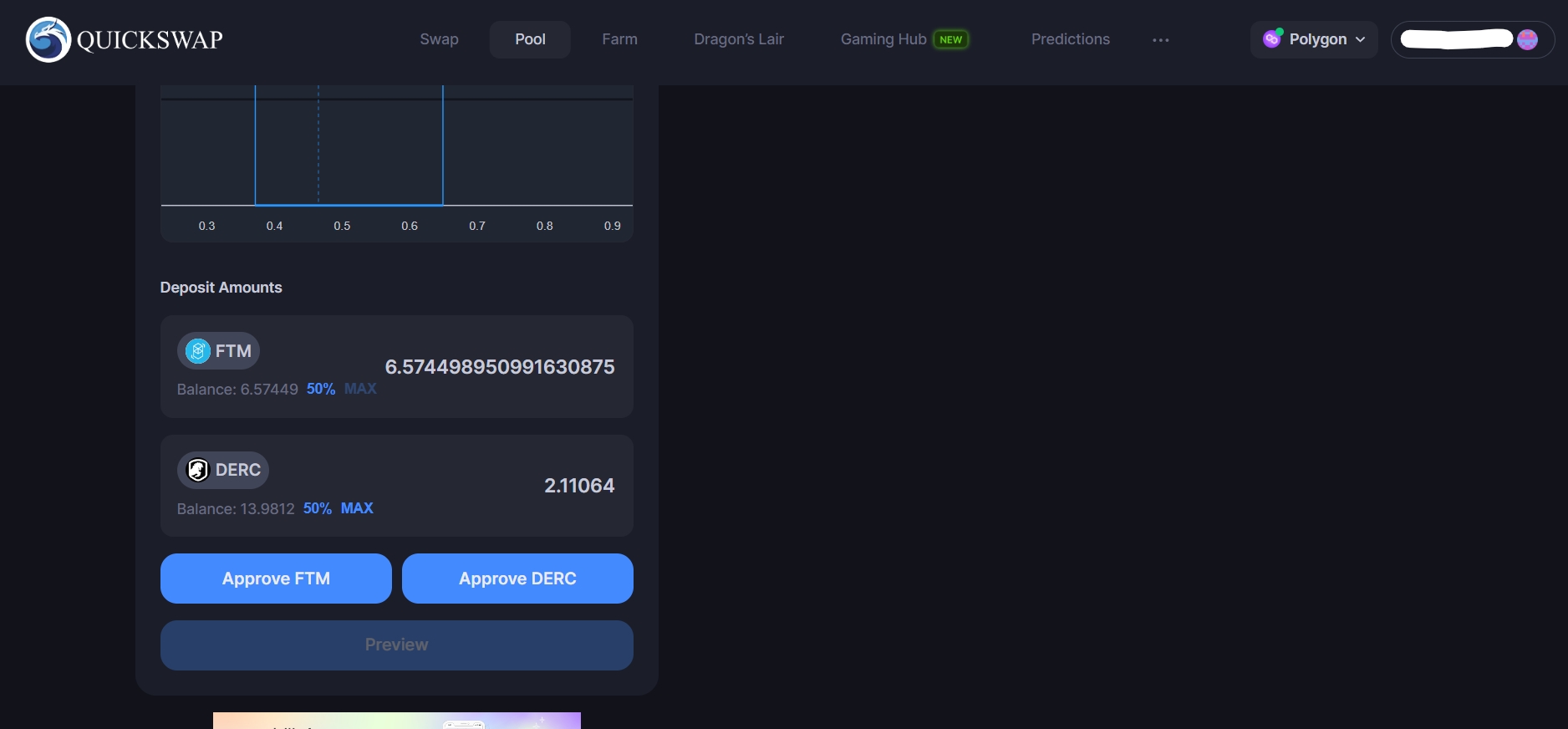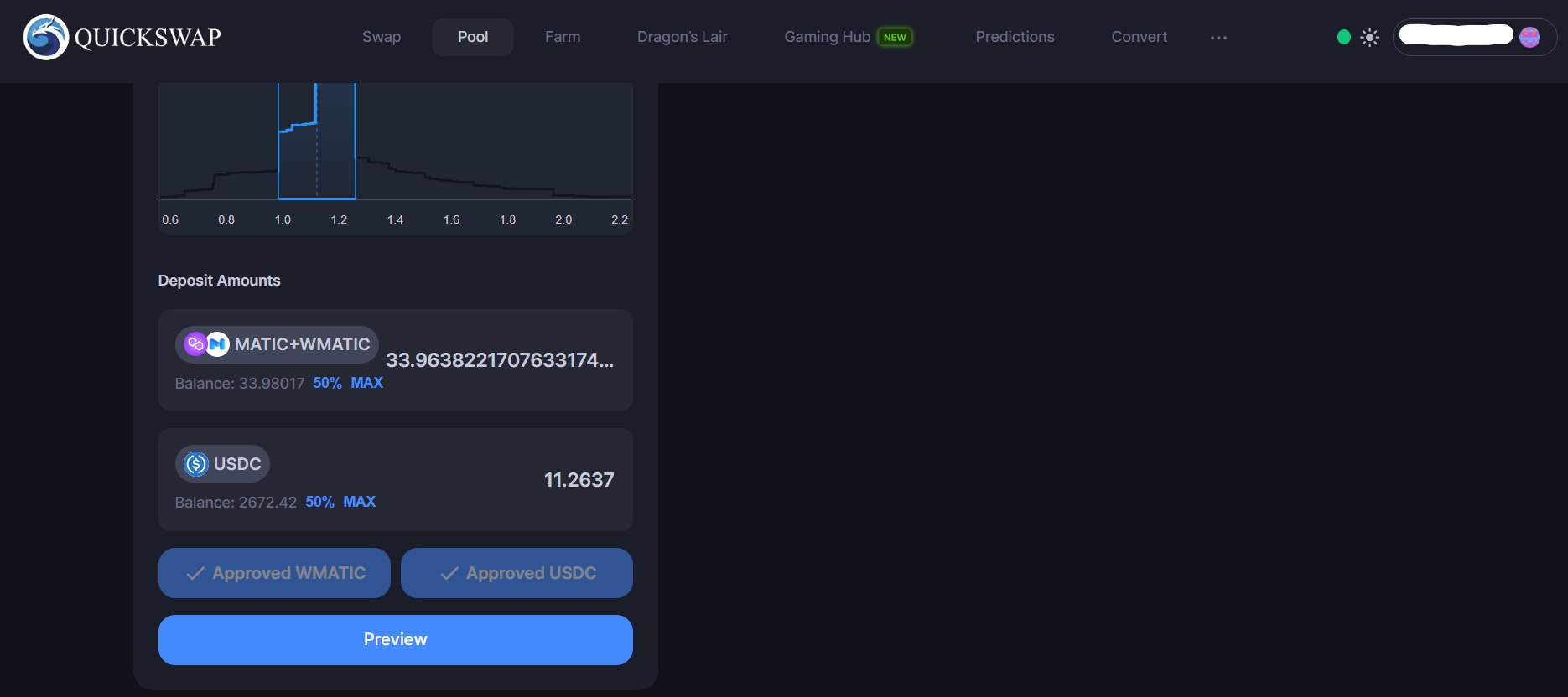 4. Next, enter your deposit amounts for your selected token pair (if you’re depositing MATIC as in this example, you’ll need to take an extra step and wrap it to WMATIC). Once complete, click Preview to continue.