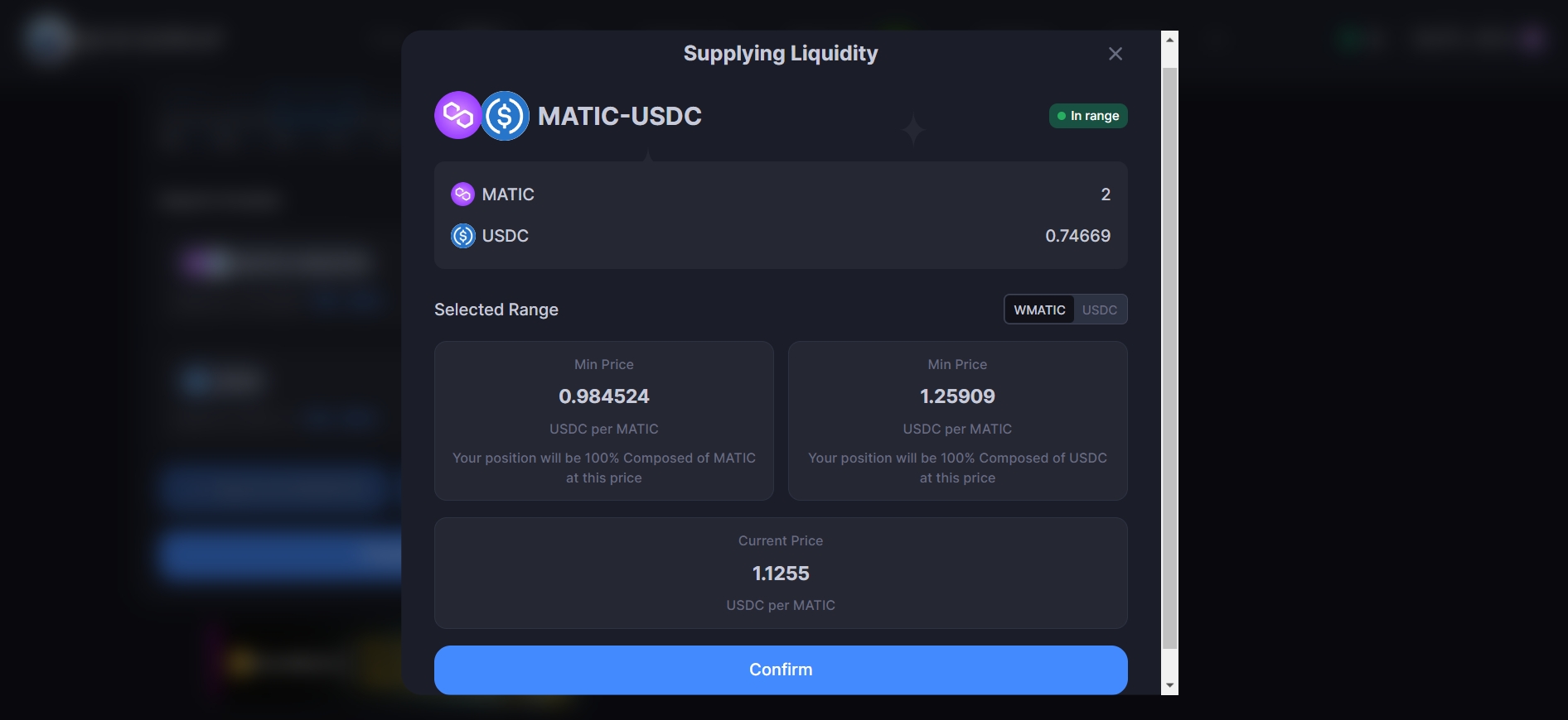 5. A popup will appear. Review the details and when everything looks good, click Confirm. Complete the transaction in your Web3 wallet to finish providing liquidity.