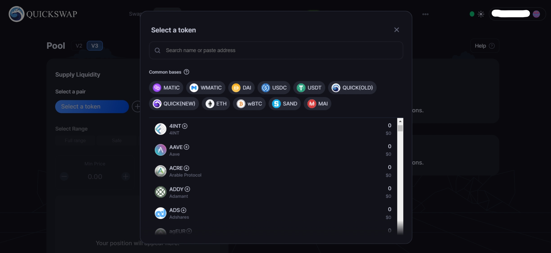 1. Visit https://quickswap.exchange/#/pools and connect your Web3 wallet. Switch to any network on QuickSwap supporting V3
